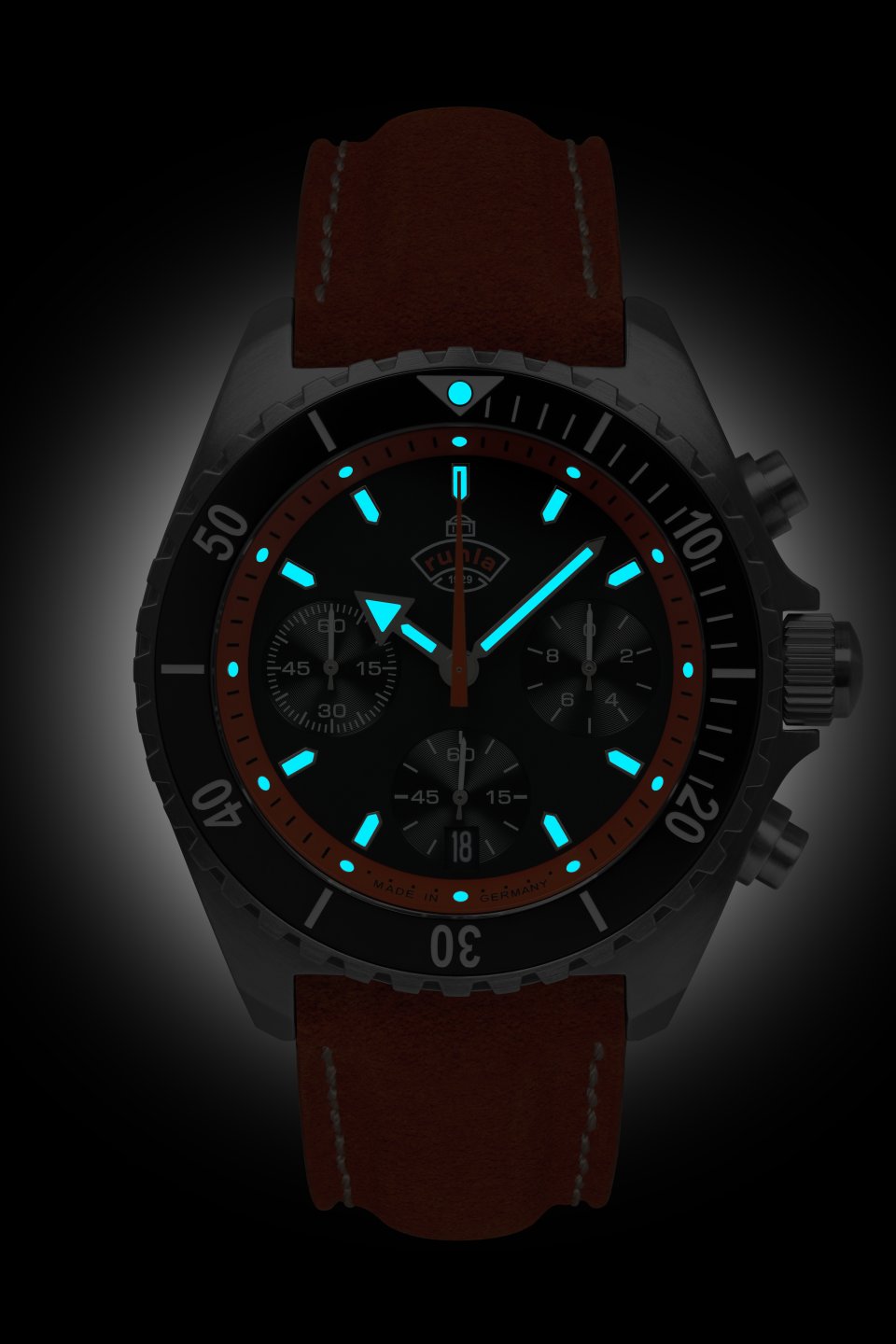 • Schwarzes Ziffernblatt mit weißen, nachts leuchtenden Zahlen/Indices, Leuchtzeigern