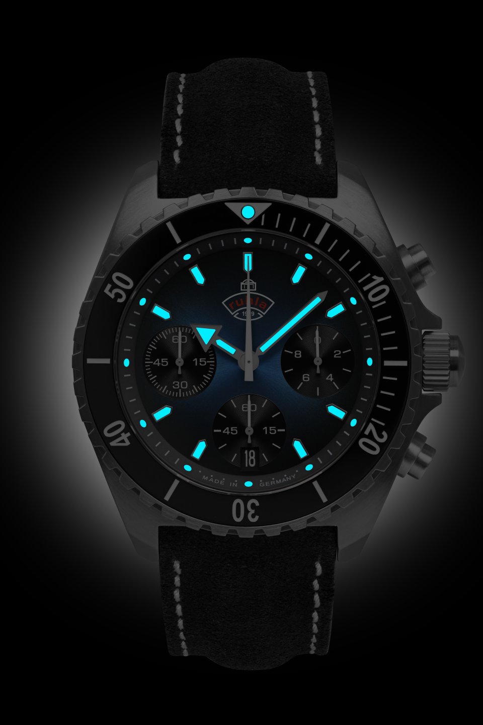 • Dunkelblaues Ziffernblatt mit weißen, nachts leuchtenden Zahlen/Indices, Leuchtzeigern