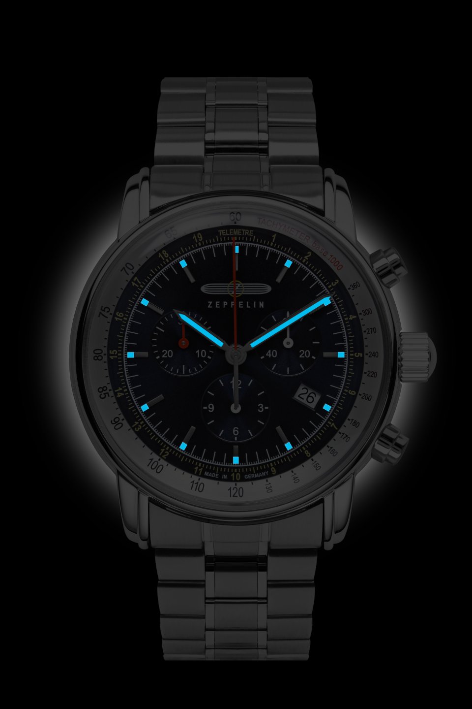 • Dunkelblaues Ziffernblatt mit silbernen, nachts leuchtenden Zahlen/Indices, Leuchtzeigern