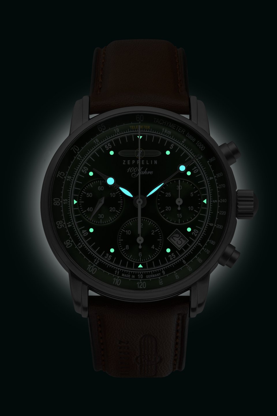 • Dunkelgrünes Ziffernblatt mit weißen Zahlen/Indices, Leuchtzeigern, Leuchtpunkten