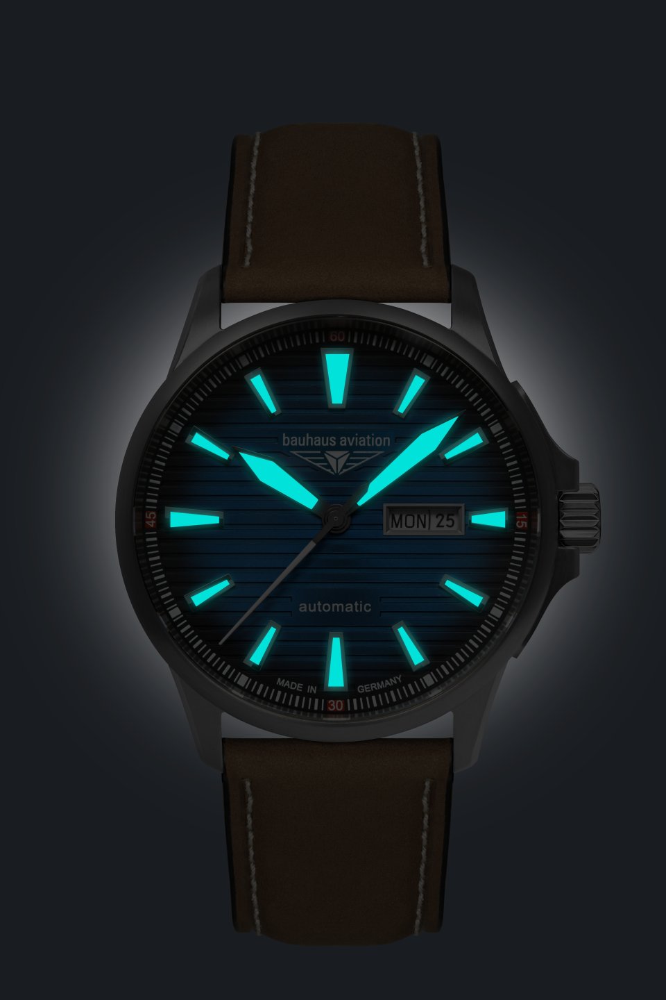 bauhaus Aviation Herrenuhr Automatik mit Day Date und Lederarmband