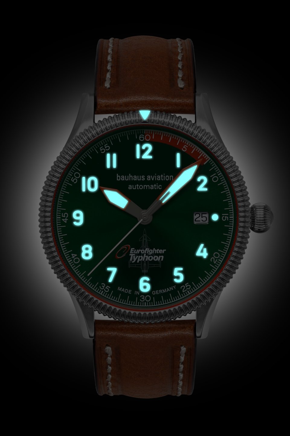 • Grünes Ziffernblatt mit weißen, nachts leuchtenden Zahlen/Indices, Leuchtzeigern