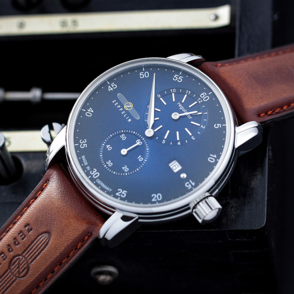 Das Design der neuen Modellreihe ZEPPELIN New Captain‘s Line greift die Begeisterung für die technische Meisterleistung auf, in einem der eleganten und komfortabel ausgestatten Zeppelin Luftschiffe auch ferne Ziele bereisen zu können. Diese Art zu reisen entspricht einem besonderen Stil, einem besonderen Flair, den die Uhren der New Captain‘s Line in ihrer Gestaltung perfekt einfangen. Diese Zeppelin-Uhren sind eine gelungene Symbiose aus elegantem Auftritt und technischem Anspruch, der im Regulatuer-Modell seinen Ausdruck in dem speziell entwickelten, exklusiven SW266.1 Regulateur-Automatikwerk vom Schweizer Traditionshersteller Sellita findet, das durch den Glasboden betrachtet werden kann. In der Regulateur-Konfiguration befinden sich die Stunden- und Sekunden-Anzeigen auf eigenen Hilfszifferblättern, während der prominente Minutenzeiger über das blaue Sonnenschliff-Zifferblatt gleitet. Eine bis 5 atm wasserfestes Gehäuse aus poliertem Edelstahl, eine Datumsanzeige bei 3 Uhr, ein handgearbeitetes italienisches Lederarmband und Saphirglas runden diesen Zeitmesser ab.