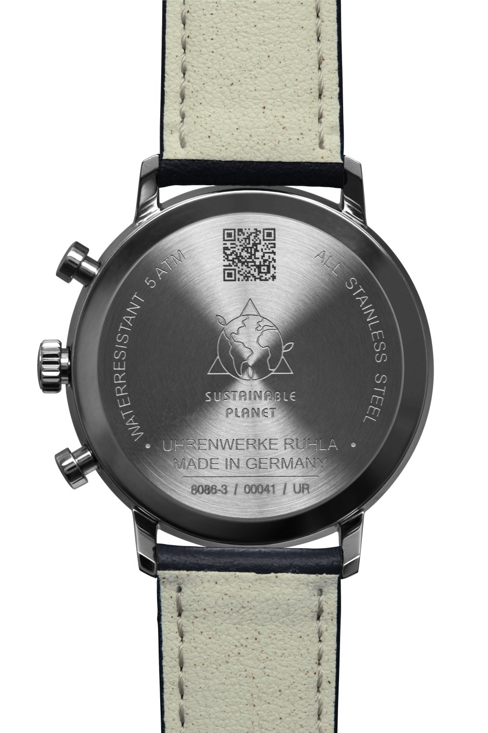 • Dark blue biopolymer dial with silver numerals/indices