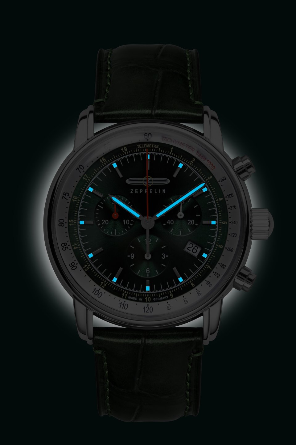 • Dark green dial with silver, night-glow numerals/indices, luminous hands