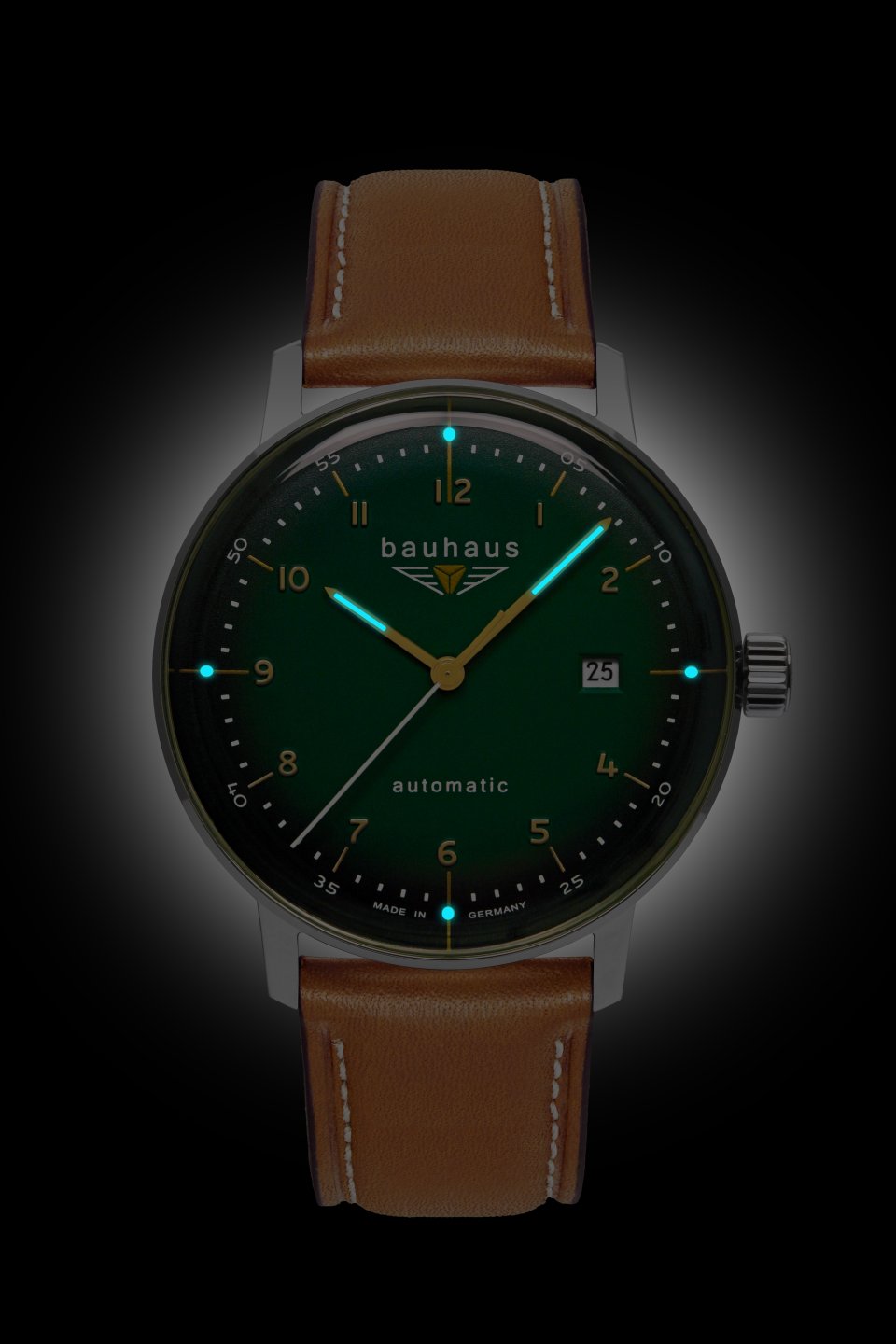 • Dunkelgrünes Ziffernblatt mit goldfarbenen Zahlen/Indices, Leuchtzeigern